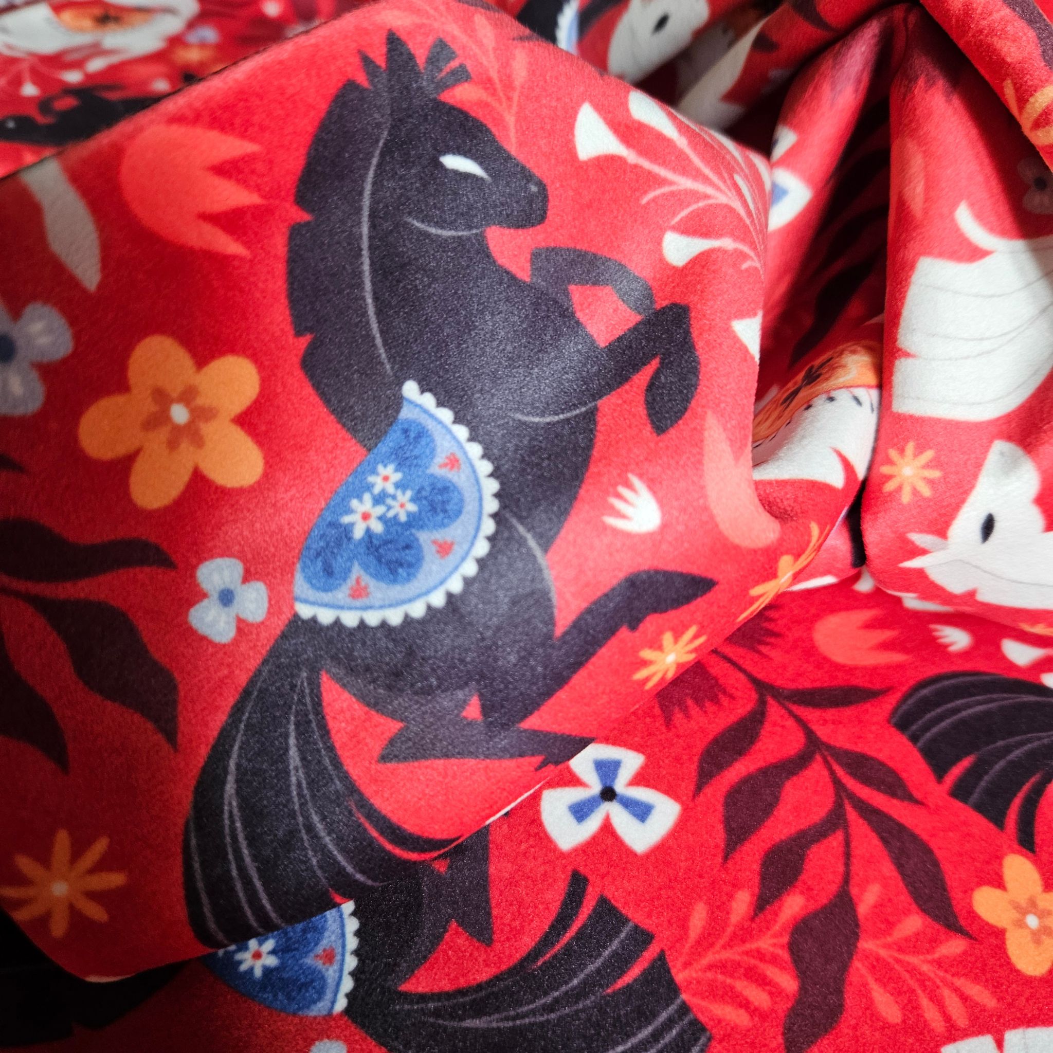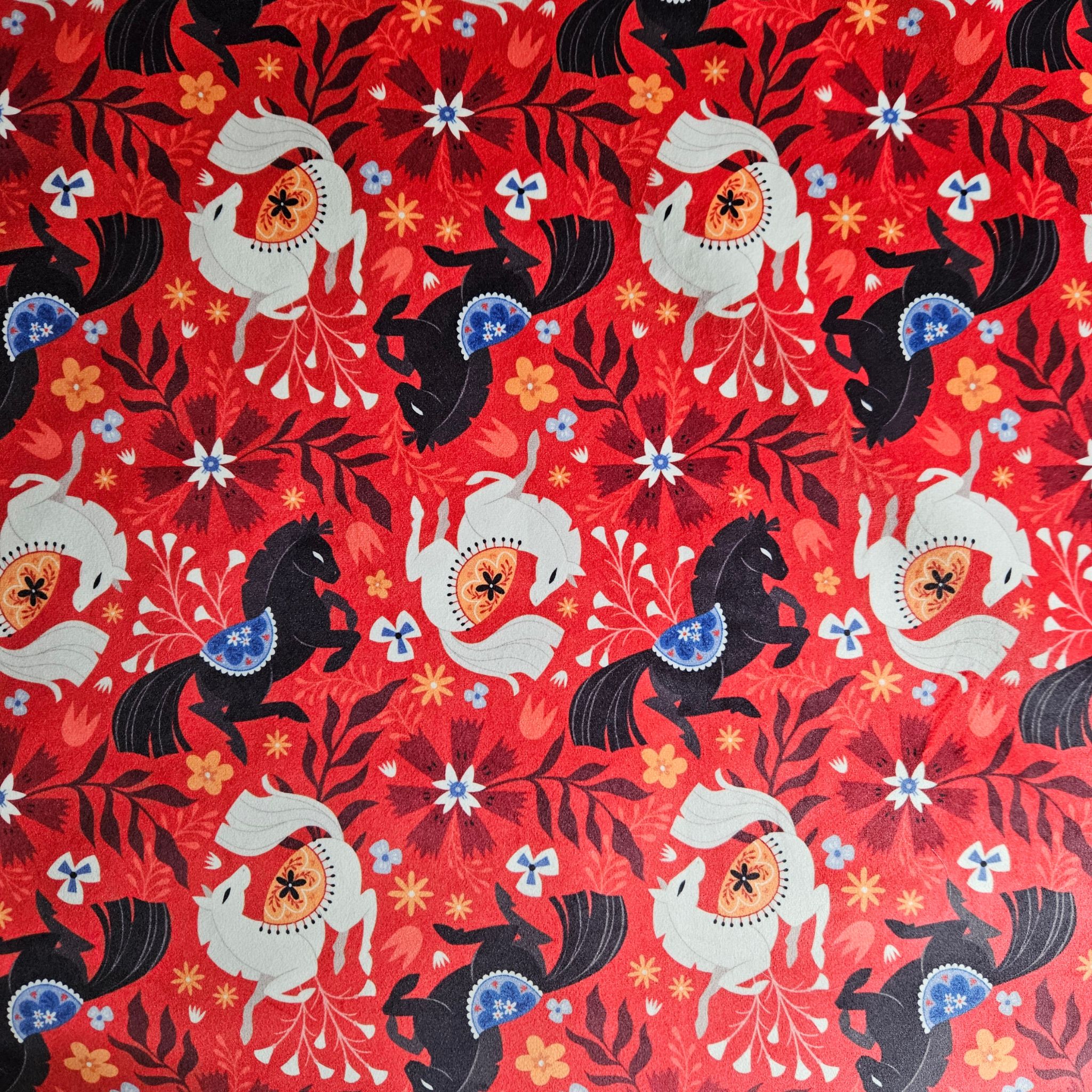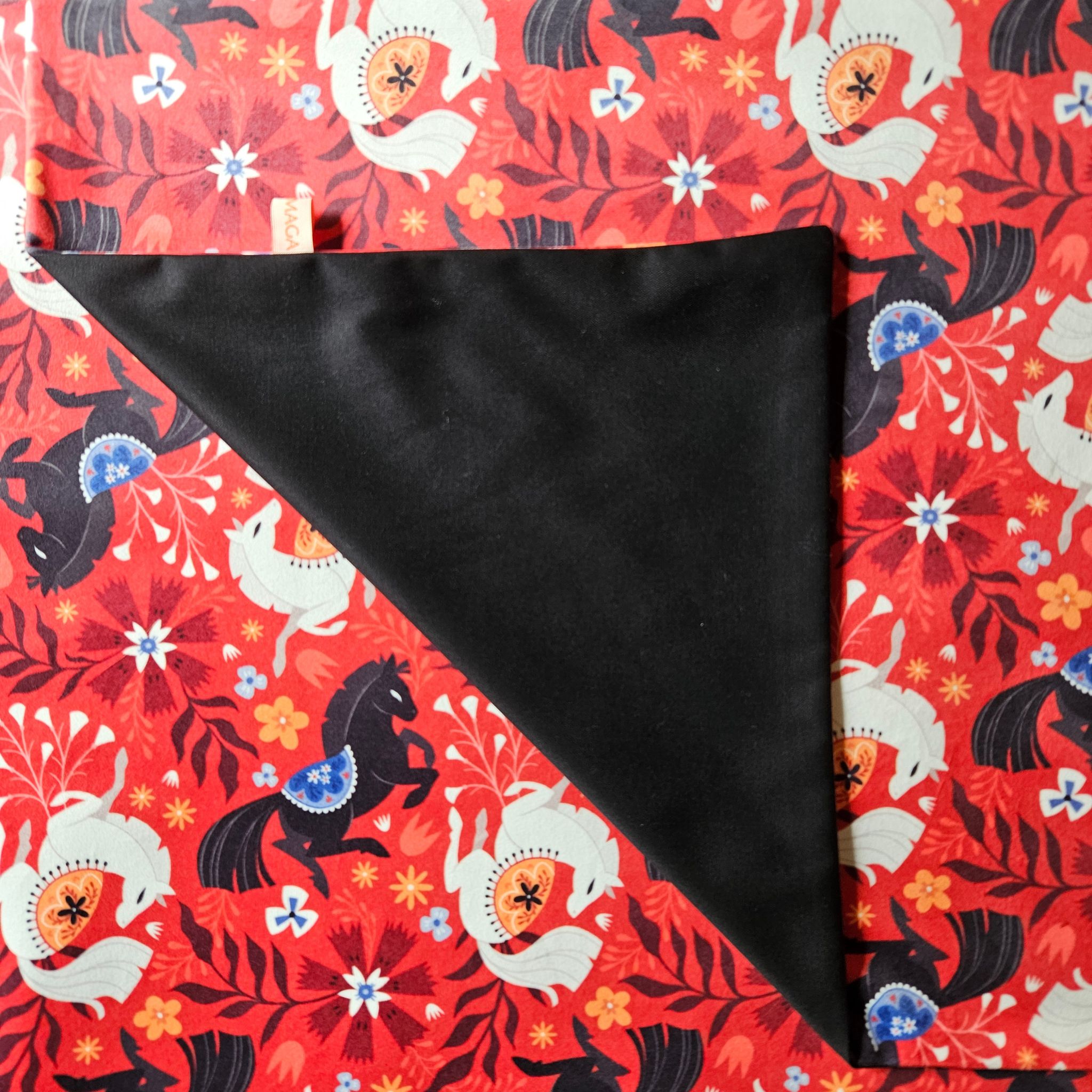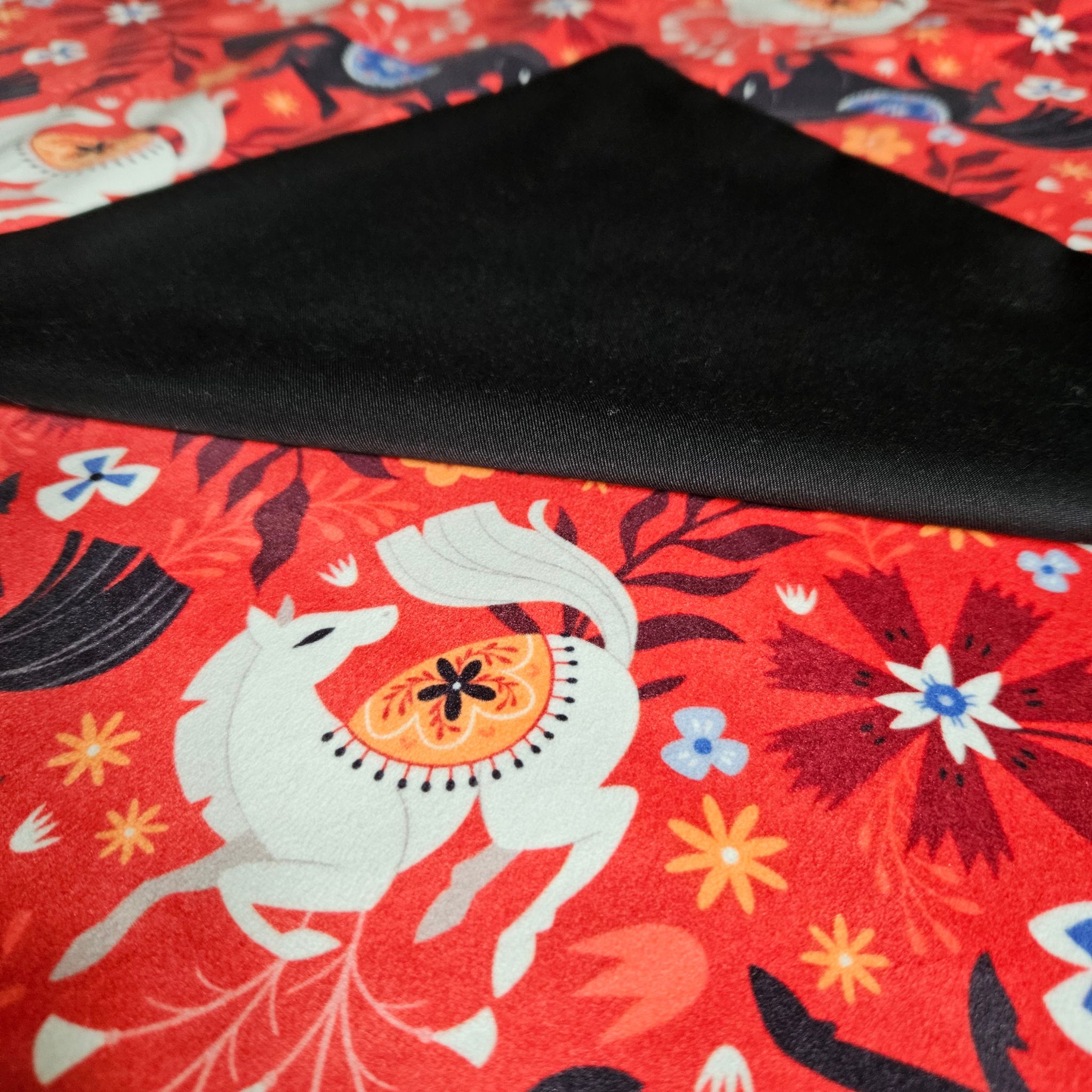 Tapis de tirage réversible Cheval de Feu : Recto imprimé sur velours imprimé / Verso : Coton /Polyester Noir